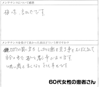 - 思うようにみがけないのでメンテナンスを受けることで助かっています。